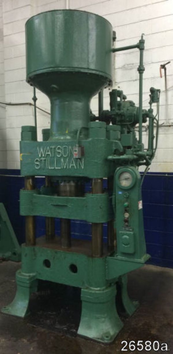 WATSON STILLMAN 200 TON HYDRAULIC PRESS S/N 8255A 4 post downstroke type, Floor standing, Distance between 4.5″ dia. posts: 28.5″ L-R x 10.5″ F-B, Area of bed (nominal): 28″ L-R x 18″ F-B, Area of slide (nominal): 28″ L-R x 18″ F-B, Stroke of fully guided slide: Approx. 0-18″ maximum, Daylight opening (total): 18″ maximum, Main ram diameter: 13″/12.25″ @ 3013 PSI – 200 tons, Floor to top of bed: 28″, Power unit (top rear of press): Hydraulic pump, driven by, 20 HP 1150 RPM 440/3/60 motor, Controls: Pushbutton operation with stroke &, pressure control, Operator pushbutton for down – up, Pressure gauge, Weight approx.: 12,500